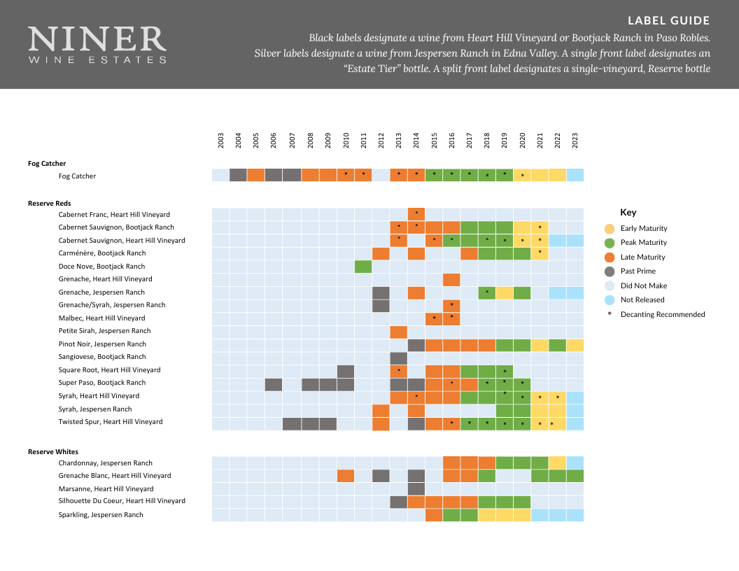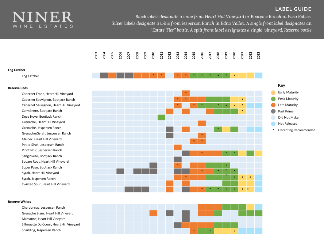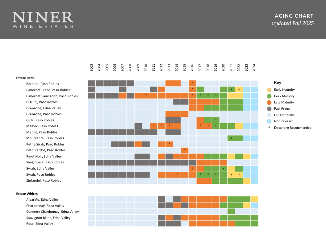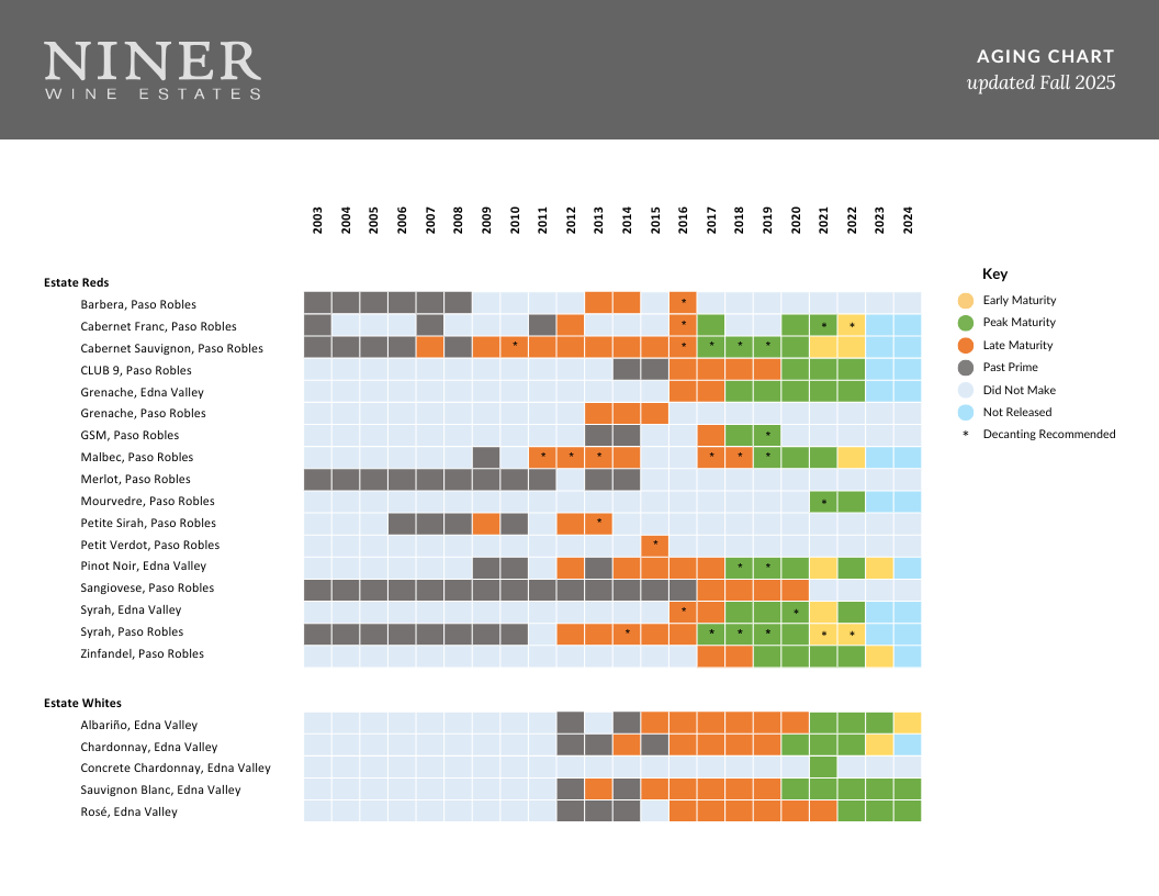 Each year our Winemakers taste every bottle that we’ve ever made and assign them a category to help you decide when to open that bottle. We release most of our wines in their “Early Maturity” stage, giving you the option of enjoying them soon or saving them for a special occasion. Certain wines evolve and taste even better after a few years of aging in the right conditions. We hope this helps you decide what to open!