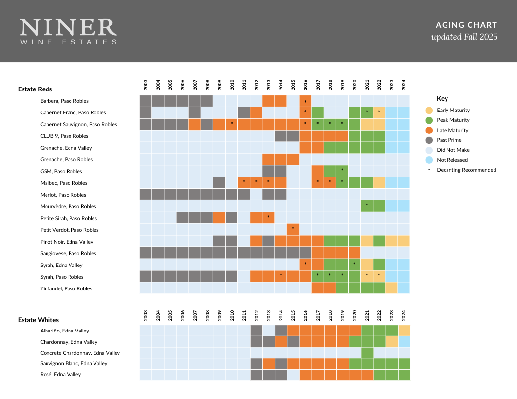 Each year our Winemakers taste every bottle that we’ve ever made and assign them a category to help you decide when to open that bottle. We release most of our wines in their “Early Maturity” stage, giving you the option of enjoying them soon or saving them for a special occasion. Certain wines evolve and taste even better after a few years of aging in the right conditions. We hope this helps you decide what to open!
